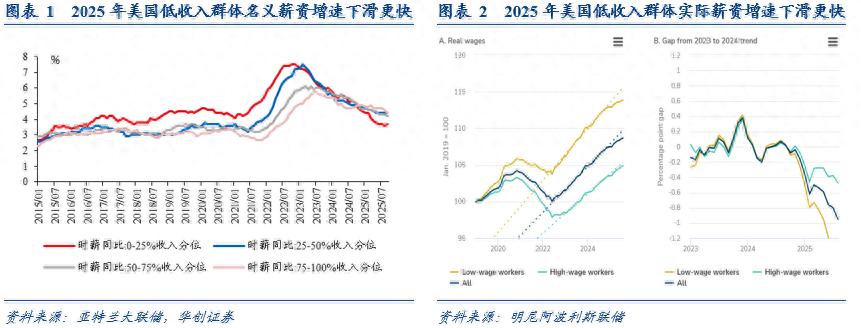 如果借鉴明尼阿波利斯联储[1](Mongey,2025)直接从供给侧进行估算的方法,拖累大约是6.7万,逻辑是用2025年净移民减少人数(160万)*移民中的成年人比例(79%)*就业人口比例(63.5%),再除以12个月,但这种方法可能会高估,因其暗含了移民劳动力均能按比例找到工作的假设,忽略了劳动力需求走弱的影响。工资数据也能侧面佐证。净移民边际减少会导致低端劳动力供给下降,如果需求不变,应该看到低薪工人的薪资增速回升,但实际上,2025年以来,美国低收入群体的名义工资和实际工资增长,相比其他群体,均明显下滑。
