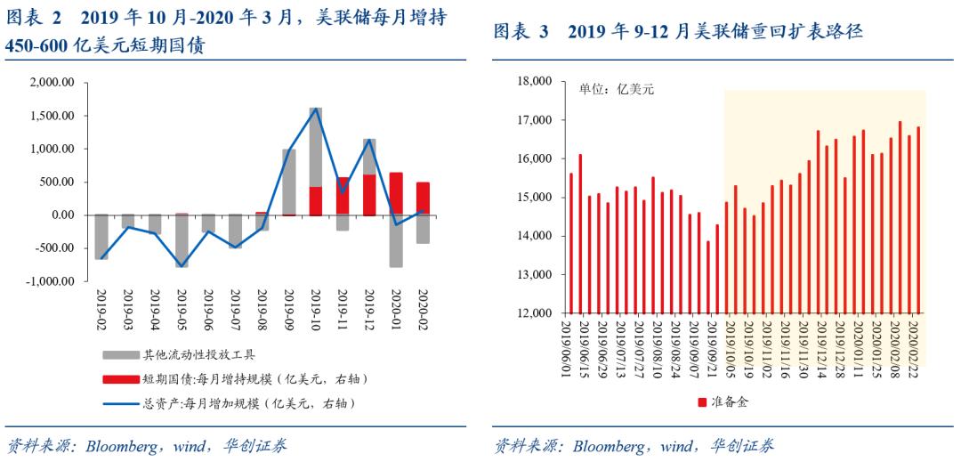 使用效果:RMP工具+临时性回购工具带来2019年9-12月美联储重回扩表路径,准备金余额从9月的约1.4万亿美元,提升至12月1.65万亿美元,超出了2019年9月初1.5万亿美元的规模。而此后2020年1-2月美联储扩表步伐再度放缓,准备金大致稳定在1.65万亿美元左右,或反映了当流动性危机缓解,美联储扩表至合意区间后,美联储的短期扩表工具也将退出。