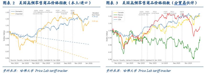 四季度的回落,一方面是受到政府关门的技术性影响。由于10月数据无法收集,美国劳工部直接用前值对10月数据进行填充(carry-forward imputation,结转插补法),其余商品和服务的价格在后续调查中得以修正(采集绝对价格,中间月份数据缺失不影响价格指数),但租金却因计算方法差异导致环比“缺失”了一个月(先计算环比,再计算租金价格指数,具体统计方法我们早在2022年就曾分析过《美国通胀回落背后的两个“细节”》)。另一方面则是关税的价格冲击可能已见顶。从细项来看,多数受关税影响的典型商品价格普遍走弱,比如家具价格下跌0.4%、家电价格下跌4.3%、信息技术类商品下跌2.2%、玩具下跌0.5%等。哈佛大学价格实验室构建的高频的零售商品价格指数(涵盖35万种商品)显示,进口商品的价格可能在去年10月份就已见顶