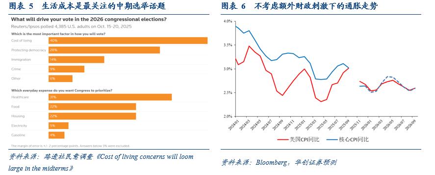 最大的上行风险,应该是中期选举压力下的额外财政刺激。最近几个月,K型分化和“生活成本危机”成为美国社会最关注的经济话题,也是选民认为驱动中期选举投票的最关注议题。近期特朗普在各类场合中对“赢得中期选举”的表态非常坚决,如果当下各类非支出项措施效果不佳(降低食品关税、打压油价、限制信用卡利率上限、指示“两房”购买MBS等),特朗普有可能出台额外财政刺激以获取选民支持,比如之前曾提过的用关税收入直接“发钱”。为避免民主党的阻挠,特朗普可通过共和党在医保补贴上的退步来交换。在这种情况下,额外财政刺激+医保补贴延续,将带来明显的通胀上行风险。中期选举的初选在3月至9月,假如真有额外财政刺激,时间点较大可能在年中前后
