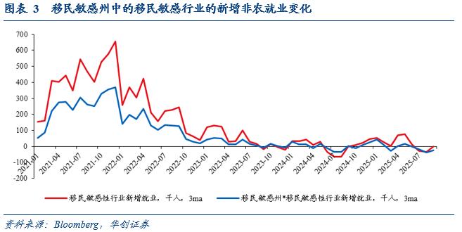 更直观的方法是,观察移民敏感行业和移民敏感州的就业人数变化。建筑、交运仓储、休闲与酒店、制造业、商业服务和零售行业雇佣的非法移民最多,根据2023年美国社区调查[2],上述行业雇佣了约78%的非法移民。根据皮尤研究中心估算[3],加州、德州、佛罗里达等十个州雇佣了69%的非法移民。计算移民敏感州中的移民敏感行业的就业变化,2024年月均新增就业约0.8万,2025年三季度(州一级就业最新数据)约-2.5万,减少约3.3万。