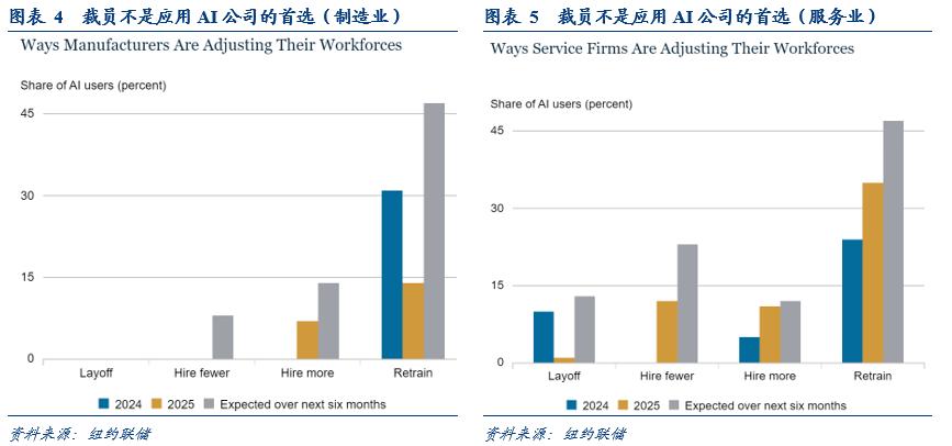 再次,AI带来的裁员影响可能有多大?约0.55-0.75万人/月。根据挑战者公司最新报告,2025 年因AI直接导致的裁员约5.5万人,若叠加“技术更新(可能涉及AI)”类别下的 2万裁员,AI相关的裁员总规模约7.5万人。需注意,海外目前并没有对AI就业影响的一致性区间估计,纽约联储的调查[4]也显示,虽然AI在美国企业中的采用率快速提升,但企业更偏向于对员工进行再培训,而不是直接裁员